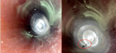检查避雷器下部绝缘筒,发现最底层破损电阻片对应位置内筒壁上有电阻片迸出痕迹,并有大量绿色粉末附着;内部发现一颗小螺丝,螺丝外观整洁无装配痕迹,避雷器器身也没有该型号螺丝,如图6所示。检查避雷器上部绝缘筒,发现顶部内壁上有发热痕迹,且表面有明显粉状物附着,如图7所示。